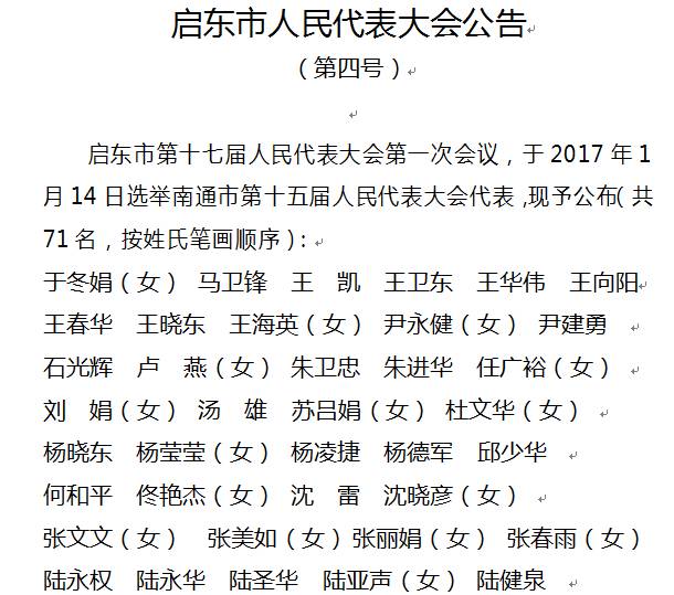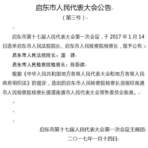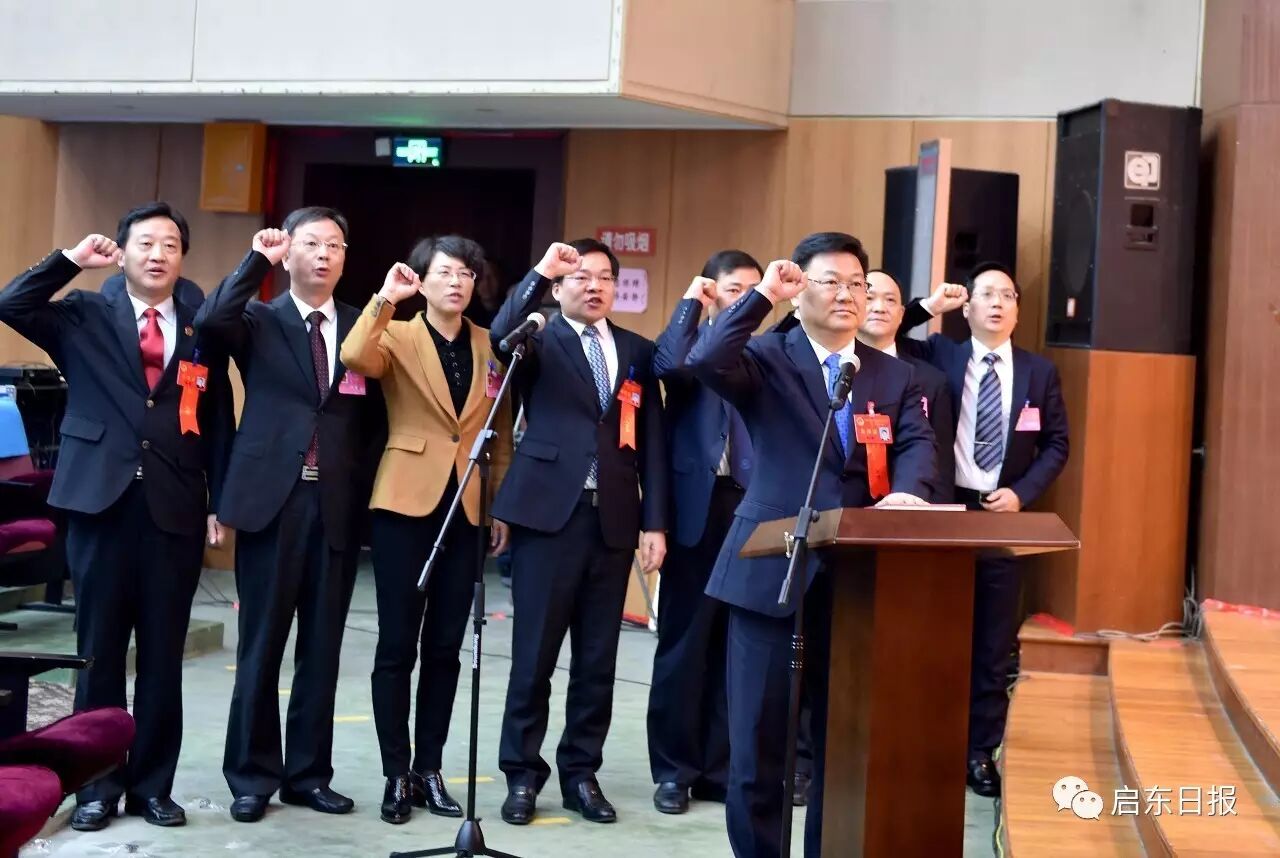 大会选举顾云峰为启东市第十七届常务委员会主任,选举张建新、张卫生、潘国红、黄松涛为启东市第十七届常务委员会副主任。选举黄卫锋为启东市人民政府市长,选举王凯、黄忠、袁圣菊、汤葱葱、高红宇、唐海兵为启东市人民政府副市长,选举潘建为启东市人民法院院长,陈新建为启东市人民检察院检察长。大会还选举了启东市第十七届常务委员会委员36人,出席南通市第十五届代表71人。新当选人员在宣誓台前进行了宪法宣誓。