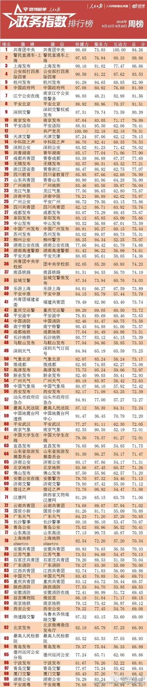 【9月12日-9月18日周榜】上周,取得“全国政务指数排行榜周榜”前五名的分别是 、 、 、 和 。本期双微周榜排名变化较明显的账号包括 (上升24名)、 (上升45名)、 (上升29名)、 (上升34名)、 (上升62名)等。上周,艺人 突然去世的消息轰动微博, 发布的通报微博因此受到高度关注,这则通报对各类无端猜测给予了有力的反击。