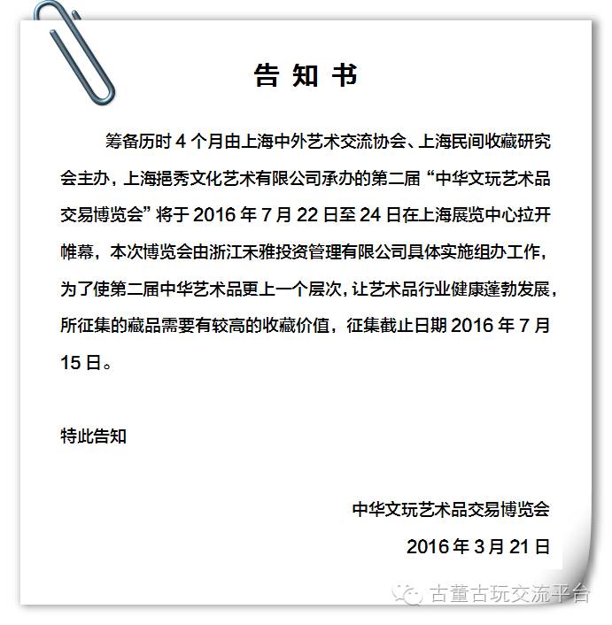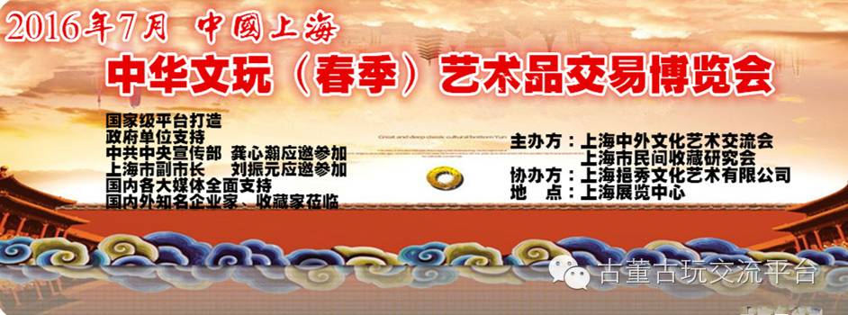 2016年“中华文玩(春季)艺术品交易博览会”,7月22日至24日在上海展览中心盛大举办,展会起航在即,在此,我们诚邀各界收藏家共同入驻2016中华文玩(春季)艺术品交易博览会,共襄文化盛举!