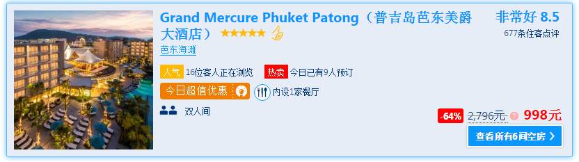 +1280元可选入住自订单晚千元的芭东雅高美爵酒店。五星级标准,距离海滩只有300米。