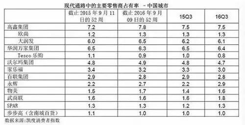 根据凯度消费指数发布的主要零售商市场份额占有率,今年第三季度,大润发、华润万家、沃尔玛、家乐福、百联等零售巨头的市占率全部处于下滑状态。
