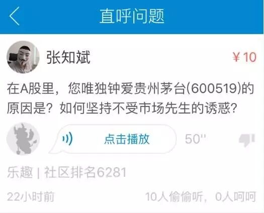淘县总舵主张知斌先生看来对“直呼”功能爱不释手,这次提问对象乐趣前辈是在股市中摸爬滚打多年、精通股林旁门左道、深得投资精髓的超级老司机,那么问题来了?既然是老司机了,那又为什么在a股这样一个投机远大于投资机会的市场里,选择长期持有贵州茅台呢?他的回答是否对价值投资者更加坚定信心?或又对您的投资风格产生新的启示呢?