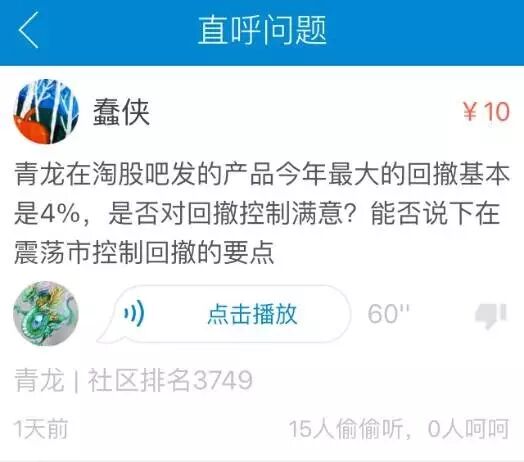 本期的压轴大神青龙——映雪资本掌门人,2015年上海地区私募排行榜榜首,今年在淘股吧发行的淘股吧映雪1号就由他亲自掌舵,同时青龙本人还是淘县的资深居民,这样的大神就在我们身边,看得见,摸不着,如果您想让青龙为您操盘,可以在每月的12日开放期申购淘股吧映雪1号。那对于青龙的操作手法,投资方向,他是如何回答网友的呢?