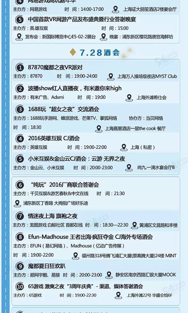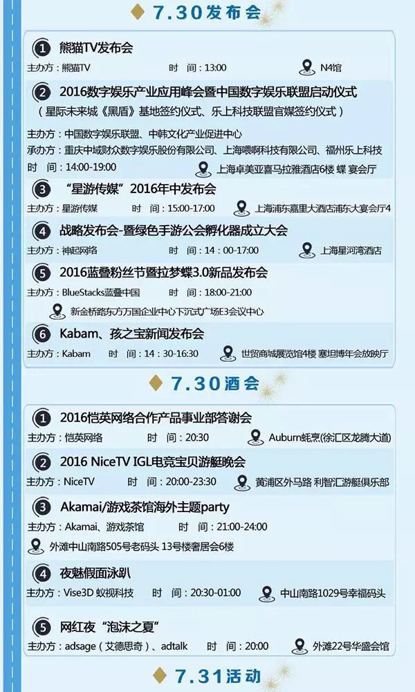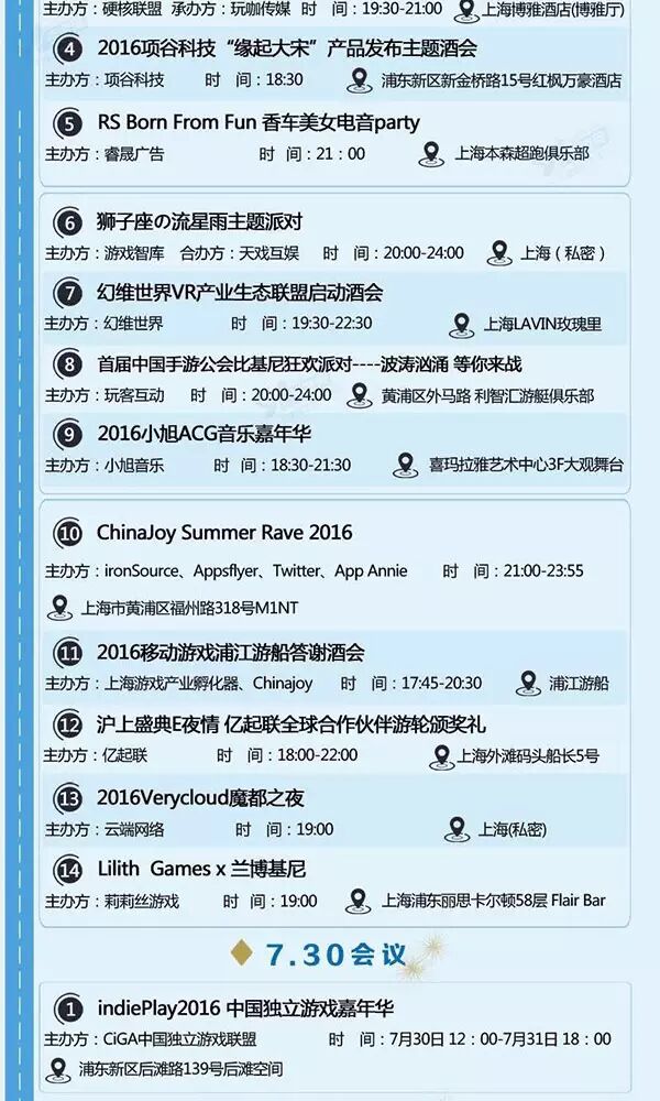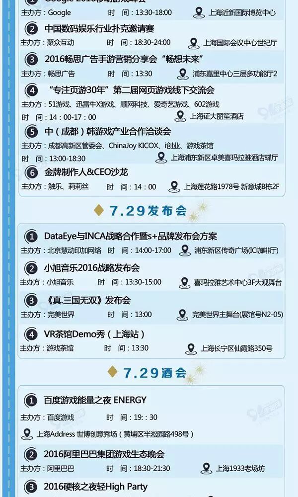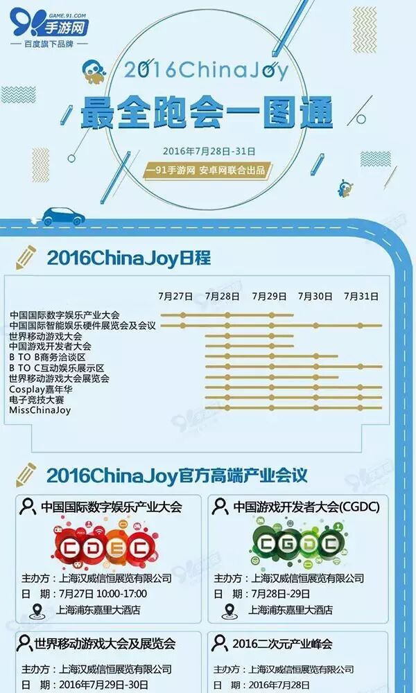 素有亚洲最大游戏展之称的ChinaJoy即将于7月28日至7月31日在上海隆重开启,届时将有数以万计的游戏玩家、厂商、媒体出席,发布会、沙龙、晚宴也将数不甚数。本次的展会除了大量IP改编手游亮相外,还有一大批新端游曝光。然而,在如此多的活动中,哪些是适合自己学习交流的高质量大会,哪些是放松娱乐交友的活动呢?今天安卓网小编给大家带来2016ChinaJoy最全跑会一图通,希望小伙伴们都能在琳琅满目的活动中寻找到最适合自己的。