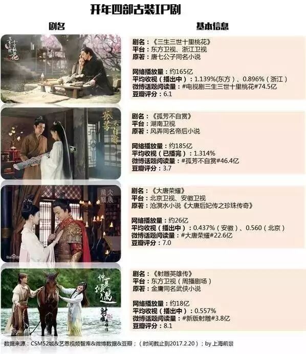 在2017年年初,各大卫视纷纷抢占开年收视高地,以古装剧竞争最为激烈。其中开年的四部古装剧《孤芳不自赏》、《三生三世十里桃花》、《大唐荣耀》、《射雕英雄传》内容涉及爱情、玄幻、宫廷、武侠,风格不同,但均为热门IP改编剧,且在开播后引发热门讨论,极具话题性和关注度。