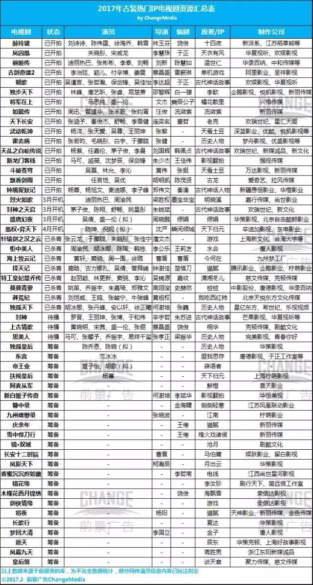 除了开年的四部古装热门IP剧外,2017年还将有哪些备播备拍电视剧进入古装IP的行列?又有哪些IP将迎来新一轮的改编与翻拍?小编特地搜集整理了一份2017年古装热门IP电视剧资源汇总表,囊括了50多部古装热门IP改编剧,这其中有你期待的吗?