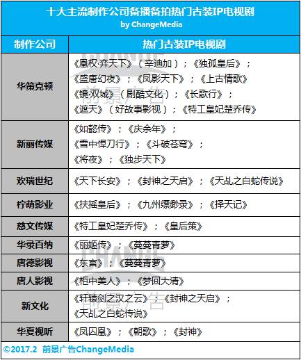 除此之外,欢瑞世纪《天下长安》、新文化《汉之云》、柠萌影业《扶摇皇后》、《九州缥缈录》、唐德影视《东宫》、华录百纳《丽姬传》等热门古装IP剧都未播先火,备受关注。