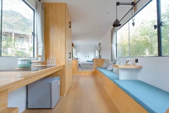 这是上海大学美术学院和镇政府合作的公共艺术巴士改造项目,赋予废弃巴士食、住、游、购等新的功能,带来旅居文化体验,现在作为一个公共艺术作品展示,不久的将来还会有更多具备超市、电影院等功能的艺术巴士入驻莫干山小镇。让我们拭目以待吧~