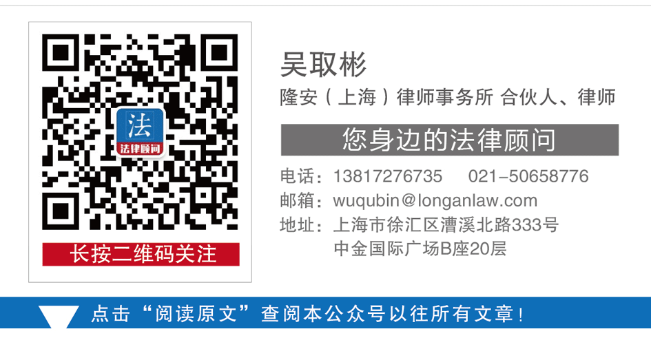 小提示:点击上方↑“法律顾问工作室”,即可关注我们!本公众号由隆安(上海)律师事务所吴取彬律师团队负责运营,我们精通企业法律事务,尤其是公司法律风险防范、股权激励、投资并购、房地产法律事务以及各类商事合同纠纷的诉讼与仲裁法律服务!
