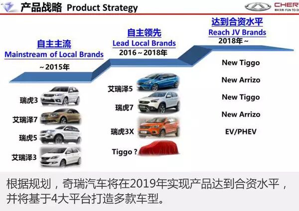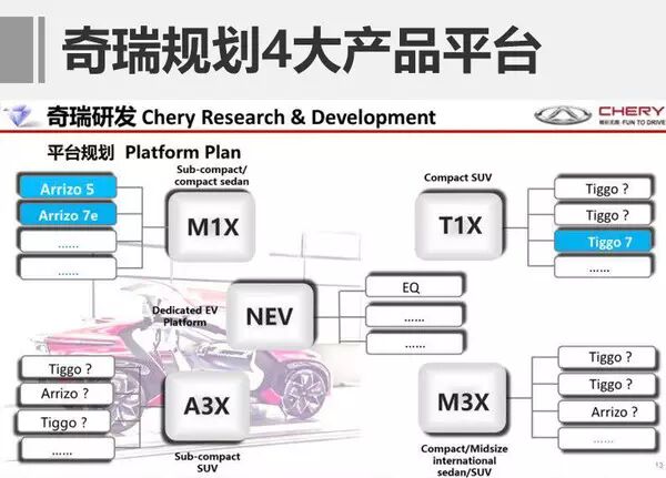奇瑞汽车上海研发中心负责人白雷蒙公布了奇瑞未来开发规划,奇瑞目前已经规划了4大产品平台,包括M1X(小型/紧凑型轿车平台)、A3X(小型轿车平台)、T1X(紧凑型SUV平台)、M3X(紧凑/中大型车平台)。此外,奇瑞还规划了专注新能源汽车的NEV平台,与4大产品平台属并列关系。基于4大产品平台,奇瑞汽车未来将推出多款车型。