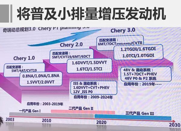 除4大产品平台外,奇瑞汽车还开发了多款全新的动力总成,传统动力方面包括1.0TCI、1.0TGDI、1.2TGDI、1.6TGDI等四款小排量增压发动机。混动系统方面,奇瑞规划了1.5T插电式混合动力系统和48V混动系统等。此外,全新动力总成有望于2019年起陆续匹配在奇瑞车型上。