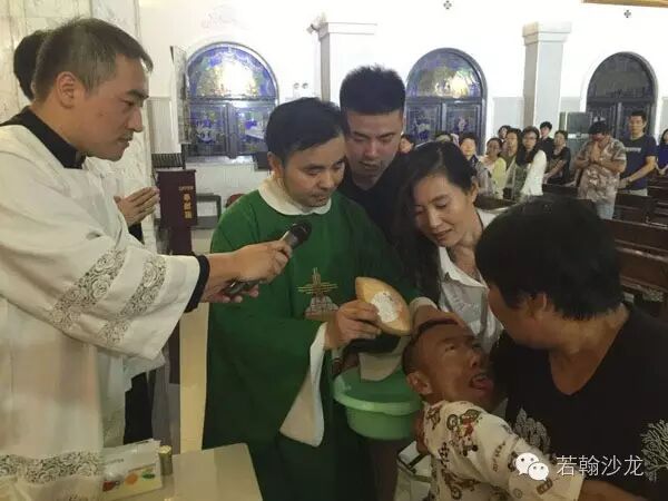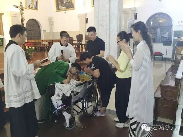 上午9时,洗礼正式开始,由本堂司铎吴建林主持,,并由桃桃的代父母代表其发言,他们表示桃桃一生坎坷,但他愿意弃绝一切罪恶和凶险,永远追随天主、追随基督。由于长年瘫痪在床,行动不能自理,桃桃无法站立,身体也很沉重,然而,吴神父,不辞辛劳,将桃桃沉重的身躯抱起,并因父、及子、及圣神之名为他傅洗,并施以坚振礼。