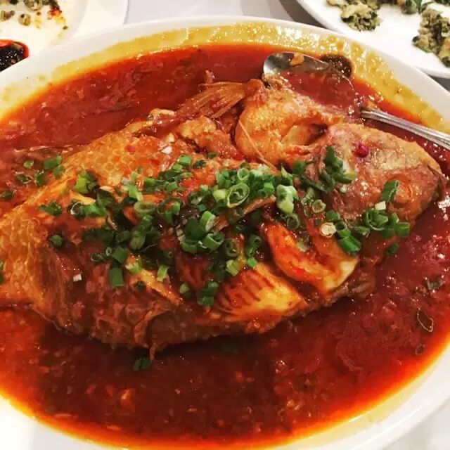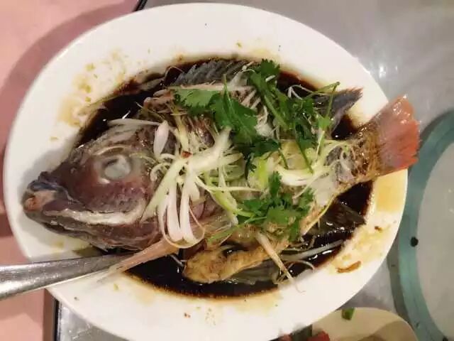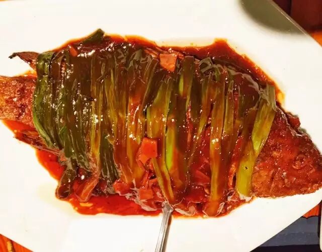 (原谅这张照片不是特别好)不喜欢吃辣的朋友们,上海菜就是你们的福音!虽然这条葱烤鱼卖相不是特别好,但是味道还是很好的,咸淡适中。