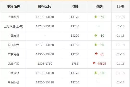 01/18:长江A00铝13130-13170均价13150涨跌-50前三天均价13230前五天均价13064(元/吨)