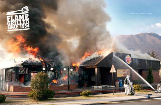 照片就是汉堡王曾经真实发生的火灾现场,只不过有人用照相机拍摄了下来,Davide由此为出发点,为汉堡王搞了一场广告活动,并做了相关宣传海报。
