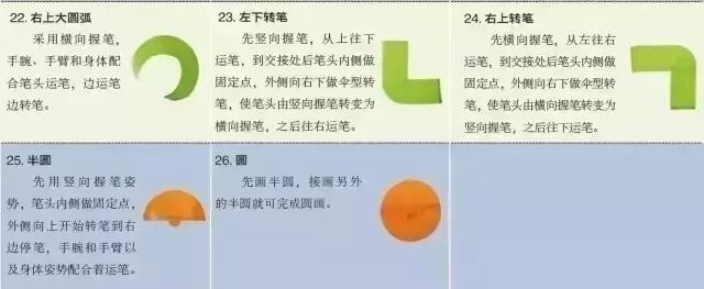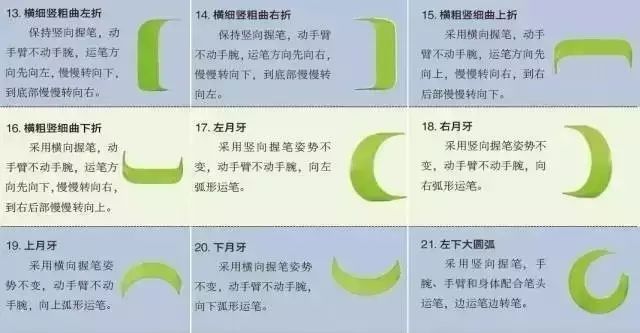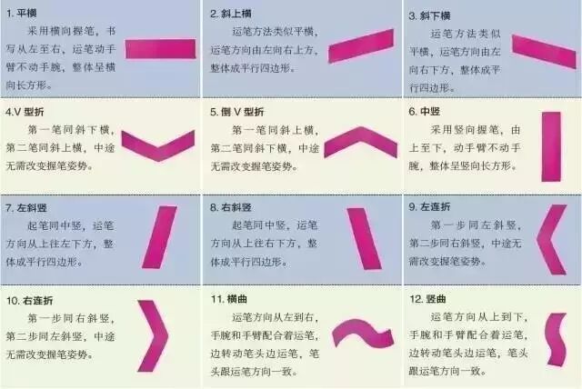 直线笔画的运笔过程动手臂不动手腕;曲线笔画的运笔过程要手腕和手臂配合着运笔,使笔尖面与运笔方向一致,且整体粗细一致。根据下面示意图,每个笔画要反复练习,直到非常熟练为止。