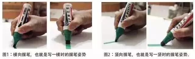 练习基础笔画时,一般使用6mm的宣传海报笔,握笔姿势类似平时握中性笔。先在纸面上打出5cm*5cm的方格,每个方格间隔0.2cm。运笔要点是笔尖面与纸面成45度角,并与纸面完全接触,用力适中,运笔速度均匀。