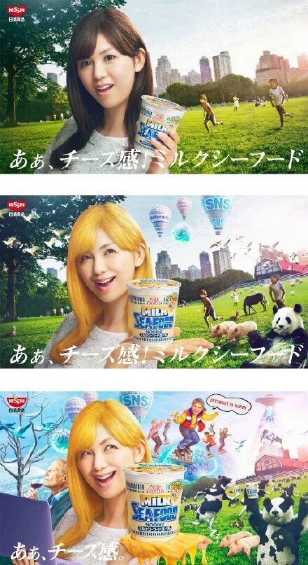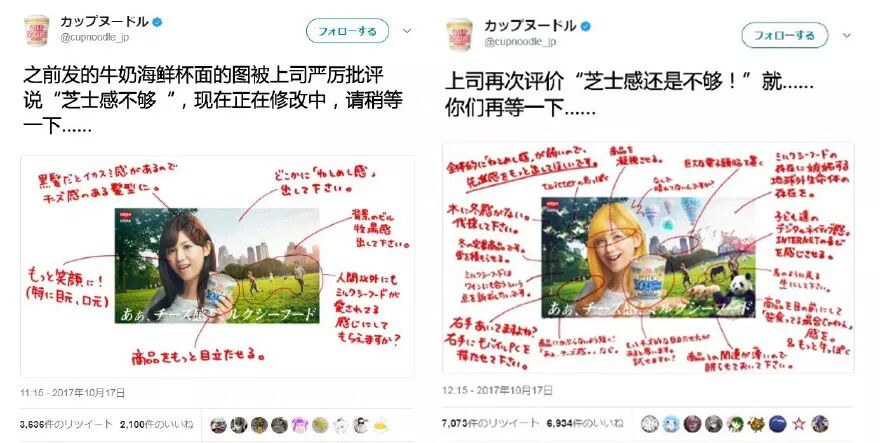 近日,日清官方推特发布了系列牛奶海鲜杯面的广告图,在社交媒体上引起热烈关注讨论。日清在 Twitter 上连续发了几张海报修改图,吐槽他们是如何按照上司的要求不断修改海报,针对上司提出的「芝士感不够」、「突出网络食品感」等需求修改出一张有趣的海报,在 Twitter 上被转发了超过十万次。据悉,这也是日清针对海鲜牛奶杯面十周年的线上营销策略。