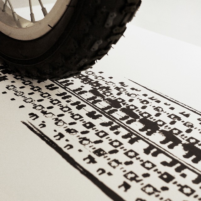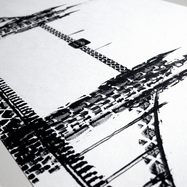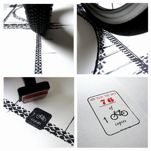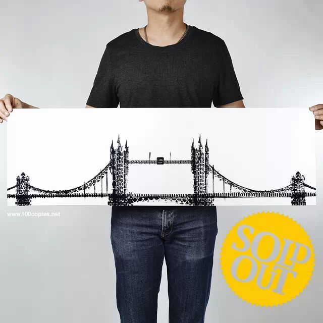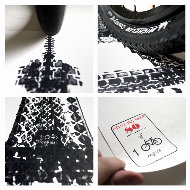 来自新加坡的Thomas Yang是一个狂热的自行车手,他将艺术与都市单车文化结合创立了“100copies”,他希望能够借自己的作品反映一个城市的单车文化。于是我们看到了一些列用单车轮胎“印刷”出来的海报作品,从纽约的帝国大厦到我们身边的天安门,以及最熟悉的埃菲尔铁塔、伦敦桥等。