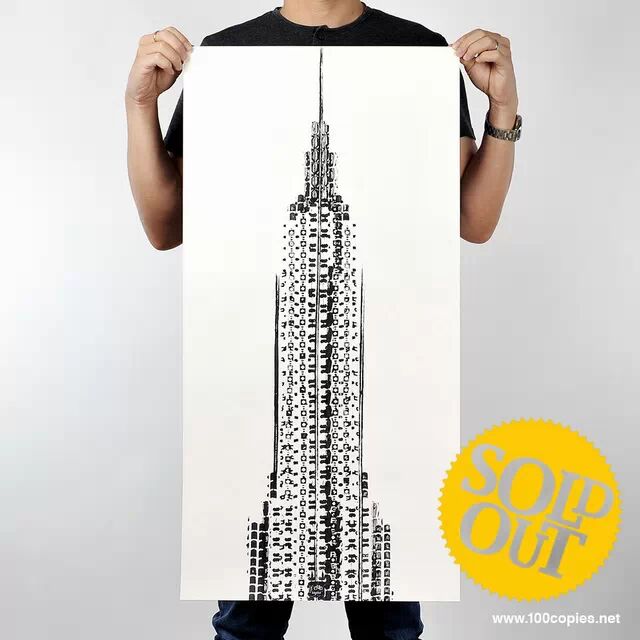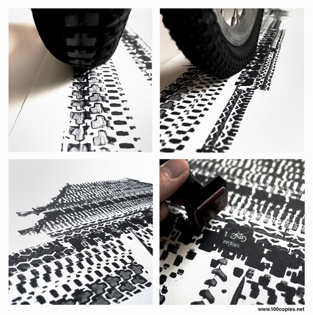 每幅作品都要用好几种不同纹理的轮胎图案才能完成,并且100copies的海报就像它的名字一样,没幅只有100份,目前看来只有天安门还没有售完,欲购从速喽~http://www.100copies.net/products