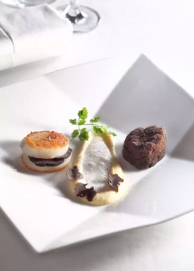小悦现在就来剧透一下这次主厨私宴的一道特别主打菜,大厨选用北海道新鲜扇贝,一只填入意大利黑松露,另外一只被大厨的精妙之手巧制为“黑松露”,把扇贝的鲜美与黑松露难以置信的口感完美结合,正可谓“食不厌精,脍不厌细”。