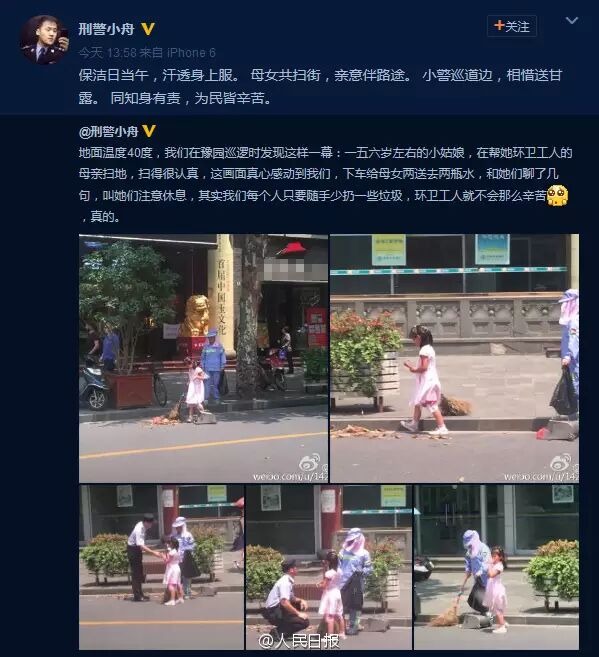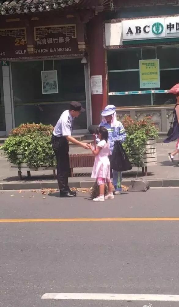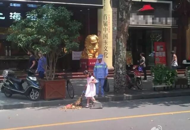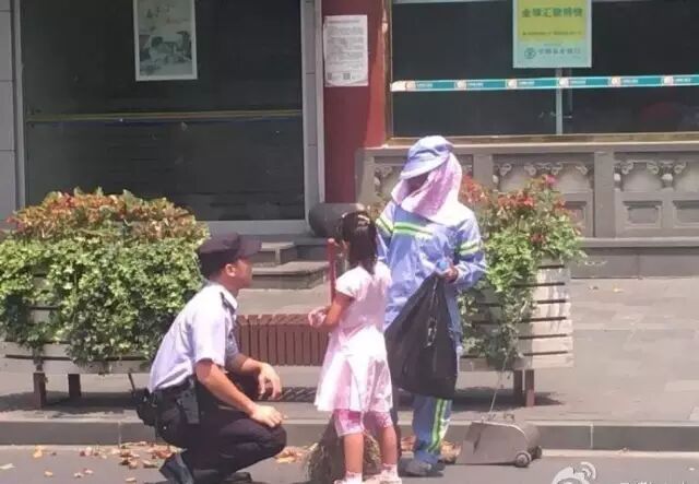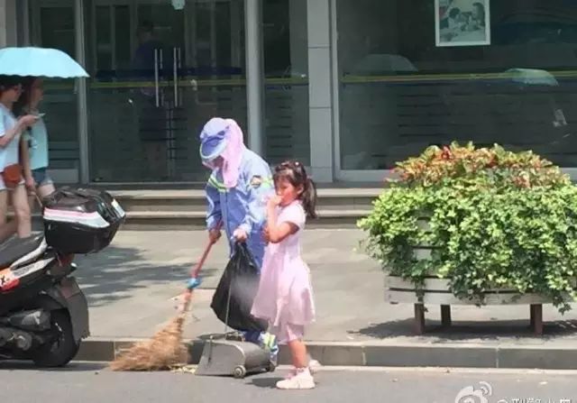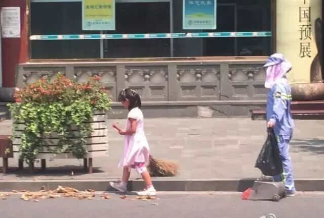 近日发了一条微博:地面温度40度,我们在豫园巡逻时发现:一名五岁左右的小姑娘,在帮她环卫工人的母亲扫地,扫得很认真……