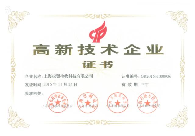 高新技术企业申请需满足拥有核心知识产权、符合重点技术领域、创新能力达到相应指标、研发费用占销售收入比例等条件。对于每家企业来说,都是一个难得的国家级的资质认证,对依靠科技立身的企业更是不可或缺的硬招牌,象征着企业雄厚的竞争力和影响力。锐翌生物按照评审标准,凭借强硬的科技创新研发能力成功通过认证。