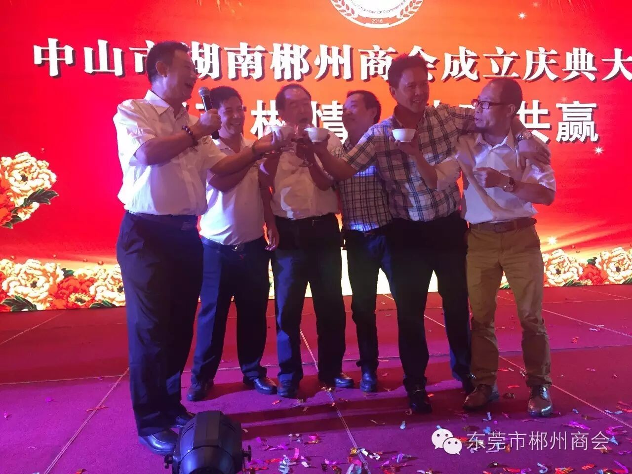 全国郴商联盟一齐来祝贺中山市湖南郴州商会成立庆典、他们分别是(从左至右)中山郴州商会会长单春光、东莞郴州商会会长肖振斌,北京郴州商会会长周世忠、长沙郴州商会会长李能文、珠海郴州商会会长罗光洲、上海郴州商会会长曹四军…