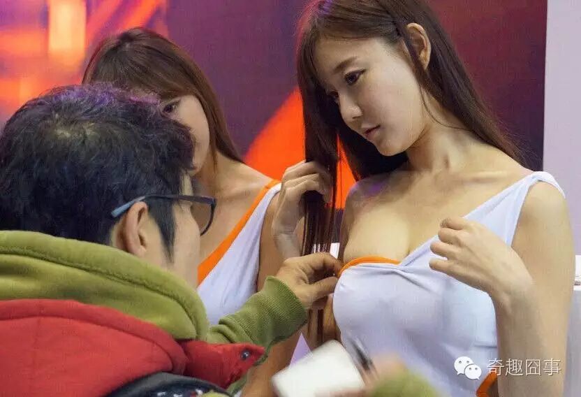 现场一个摄影师在展台前公然伸出咸猪手在一位Showgirl胸部上比划着,摸摸这里蹭蹭那里……