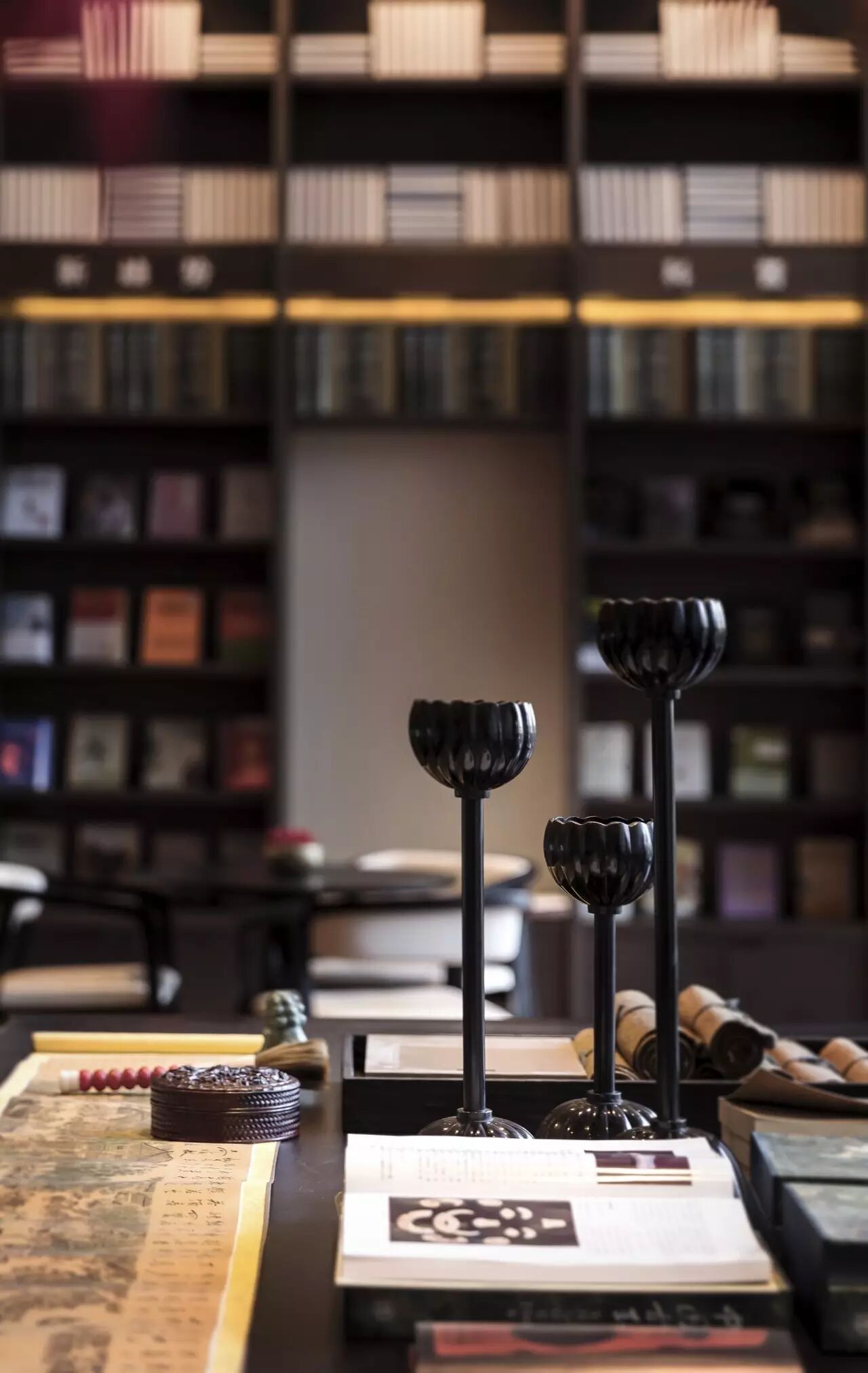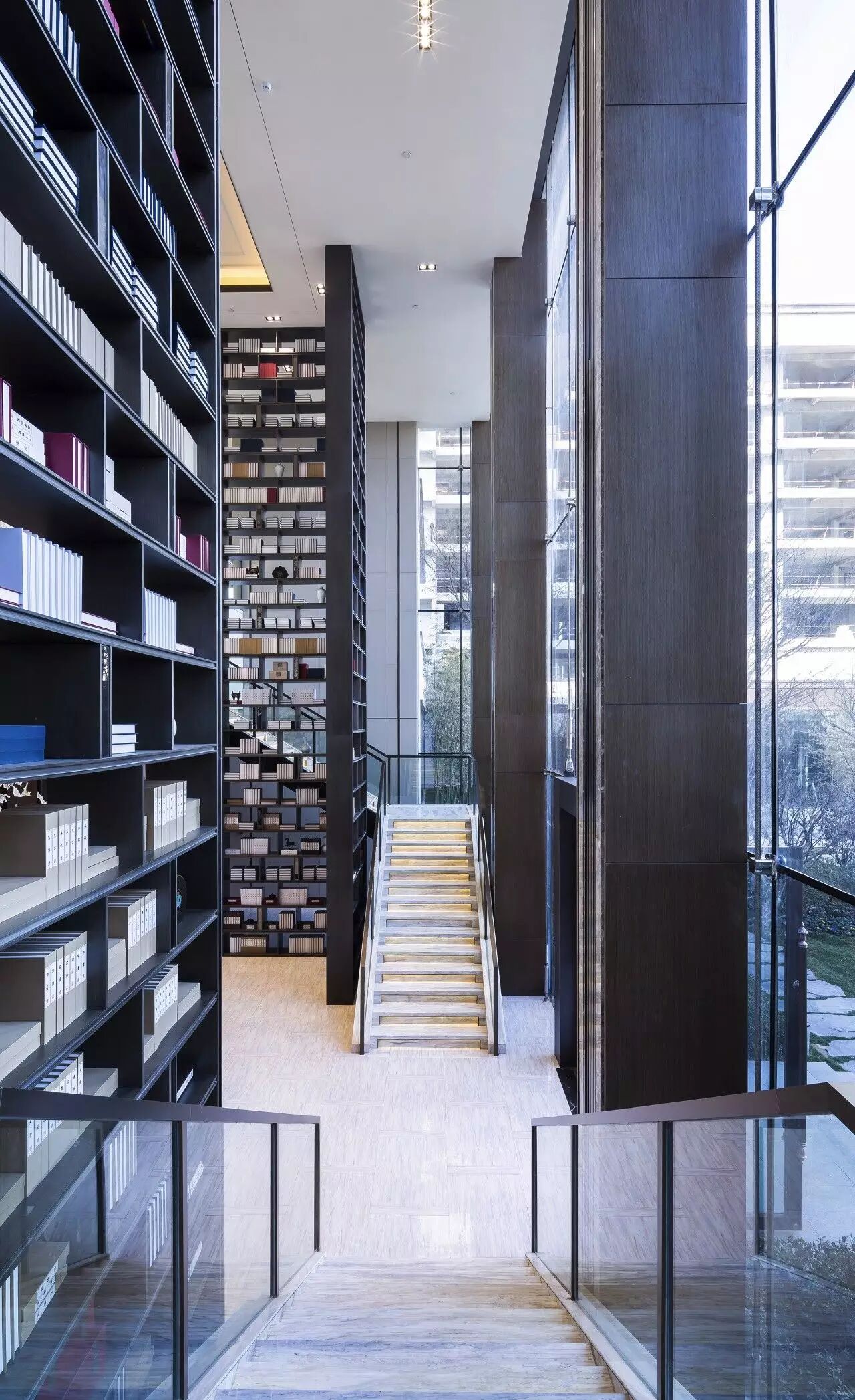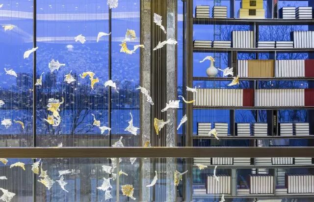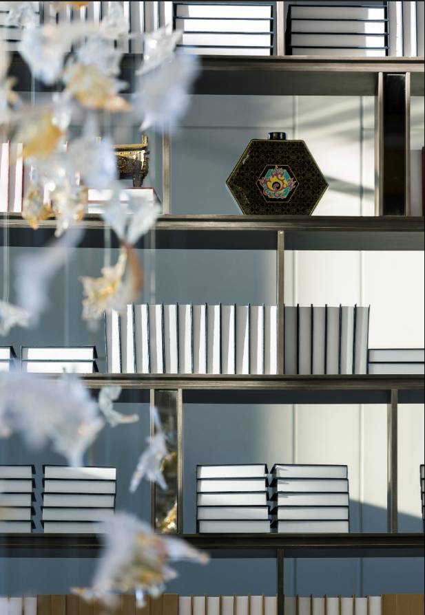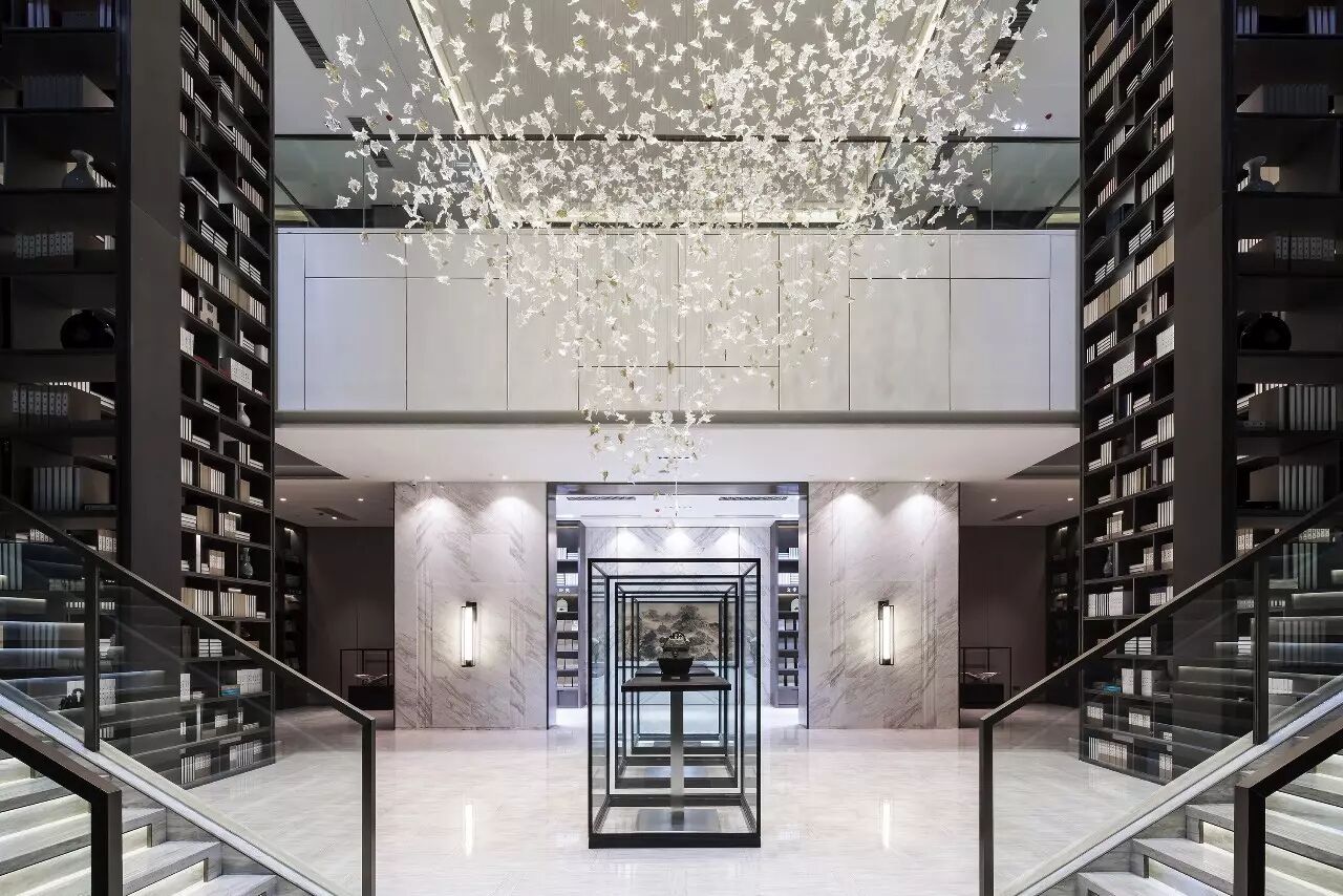 大厅区域两侧超高层的书架左右对称,而饰品陈设营造出皇家书院独有的仪式感和序列感,尊贵的体验感油然而生。主入口处的大型艺术吊灯装置为此项目的设计亮点,一片一片散落在空中如历史的印记,一步一个脚印见证着汉唐盛世流传至今的悠远文化底蕴。