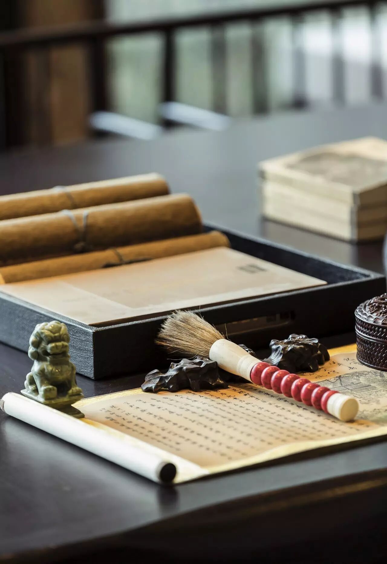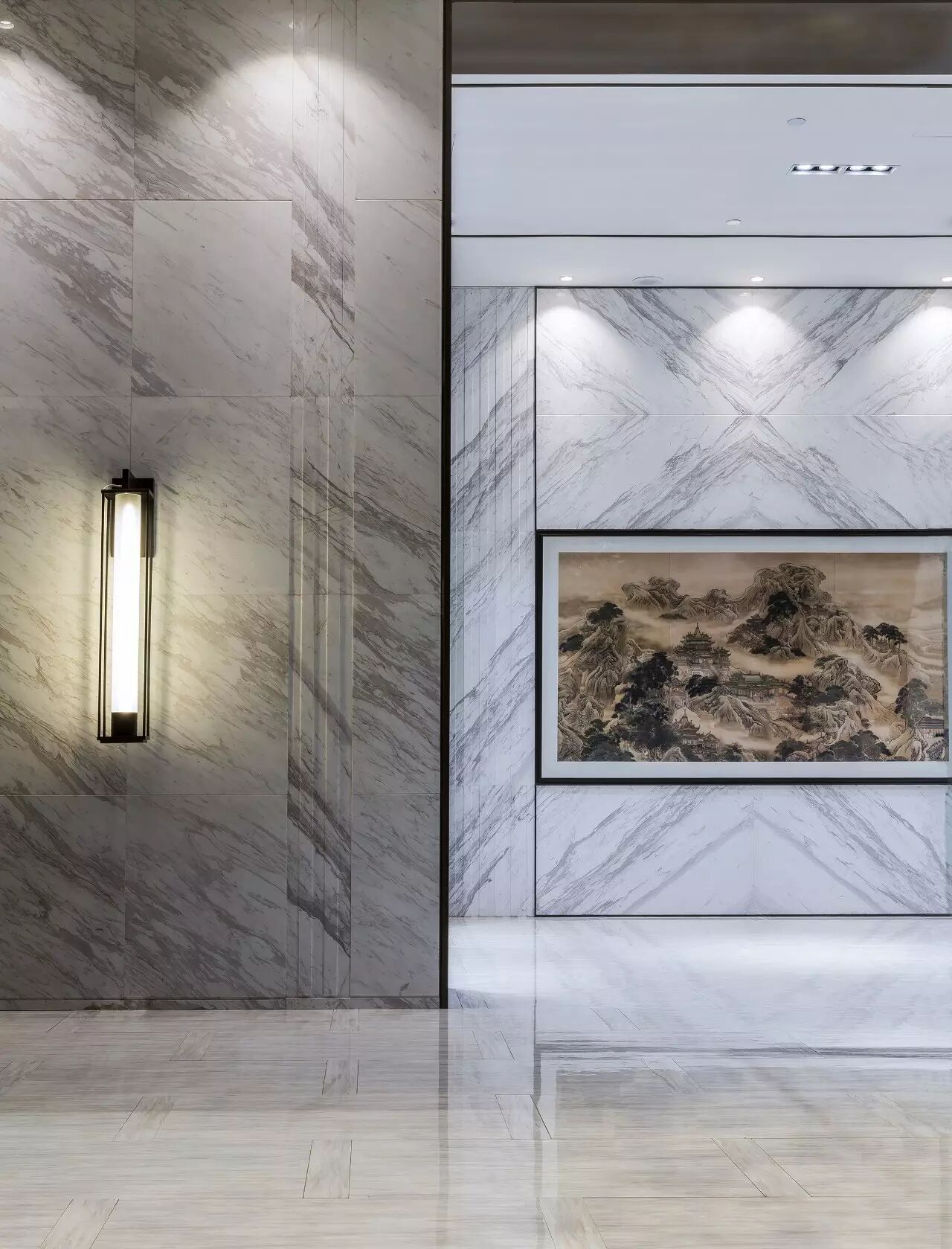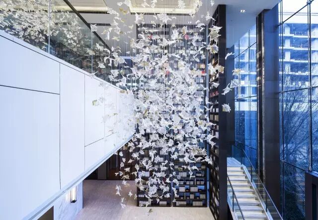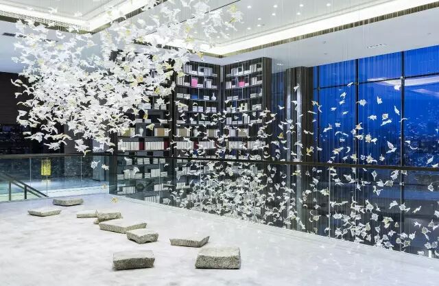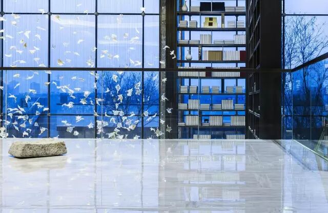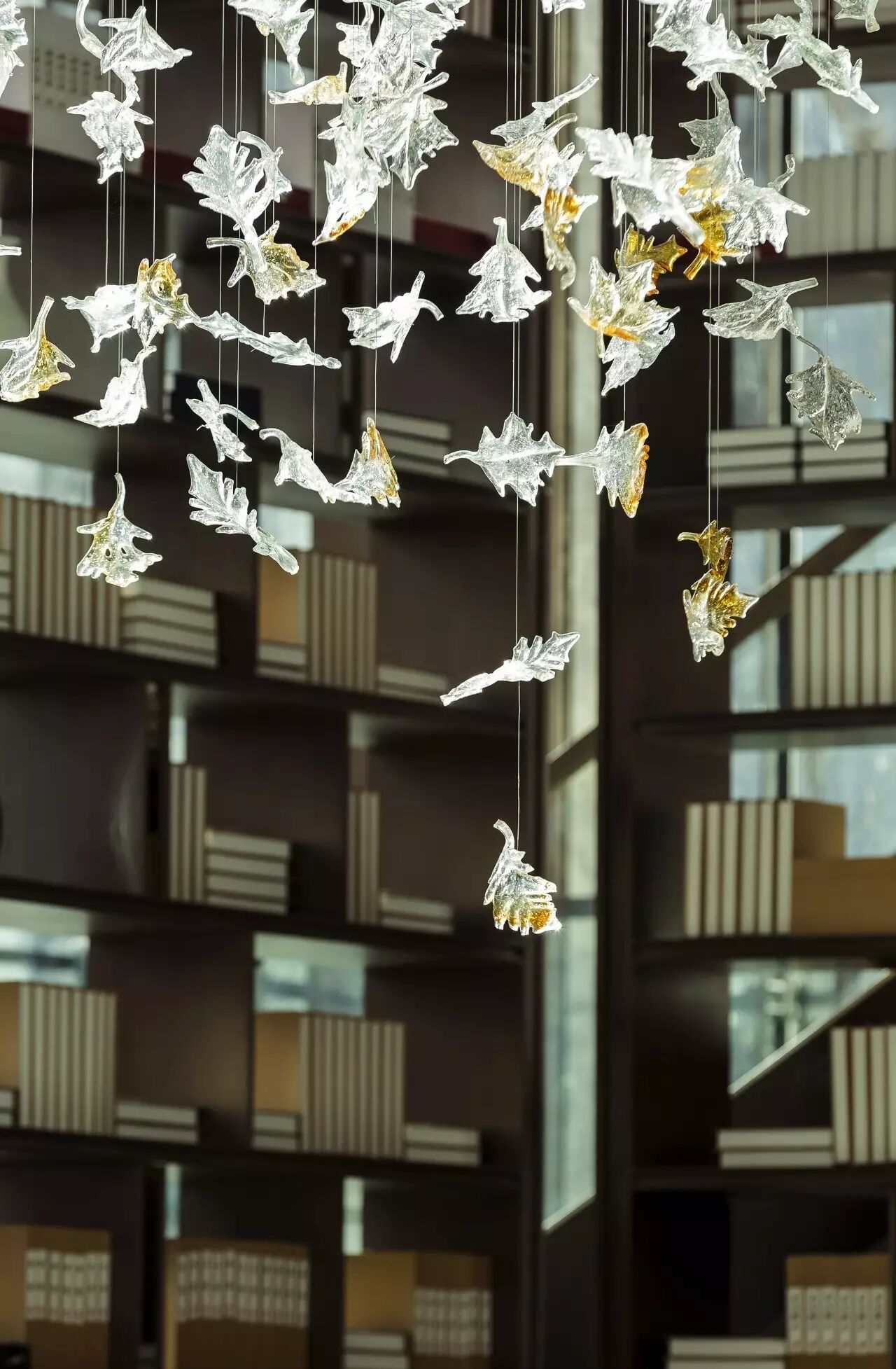 大厅区域两侧超高层的书架左右对称,而饰品陈设营造出皇家书院独有的仪式感和序列感,尊贵的体验感油然而生。主入口处的大型艺术吊灯装置为此项目的设计亮点,一片一片散落在空中如历史的印记,一步一个脚印见证着汉唐盛世流传至今的悠远文化底蕴。