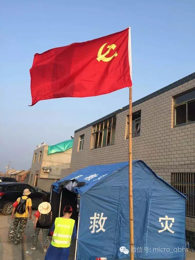 在受灾严重的王村,杨老师领到的第一个任务是:驱车到20多公里以外的立新小学救灾物品安置点领取“救灾帐篷”并搭建起来。近十平米的大帐篷搭建在哪里?在一片废墟的村庄,想要找到一片平整、干燥、清洁的地面谈何容易!不过克服困难,在下午4点左右终于在受灾严重的王村建立起“心理关爱站”,面对高高飘扬的党旗,志愿者的内心充满了力量。