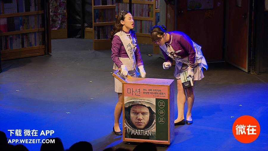 现在无论是电影还是戏剧,节奏都越来越快。很多导演都是一年一部作品的高产出,有时候难免会有失水准的作品。但《洗衣服》的导演秋民主有且只有这么一部作品。2005 年的时候,这部剧只是她的一个低成本毕业作品,没想到却一炮走红。成名后这十年,她一直对这部剧进行修改,不仅故事愈发完善,就连舞美、服装细节等都在跟着时代走。在剧中书店的戏里,我找到了这么一个《火星救援》的海报的细节。另外,舞蹈方面也融入了去年鸟叔新 MV 《Daddy》的搞笑舞步。