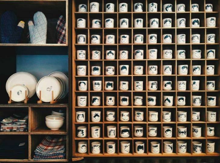 Brut Cake Café坐落在古時稱為華界的愚園路上(愚園路698號),大片玻璃窗門讓和煦陽光肆意灑入,以暖白和木質色系為基底,搭配自然樸素的水泥地面,不浮華、不矯作。進門的人坐在舊木和江南老土布拼貼的椅子和矮凳上,愜意閒聊、美拍、閱讀。長桌上,炸雞鬆餅鮮嫩脆口,單品咖啡香氣四溢。空間沒有嘩眾取寵的裝飾,用最簡約的方式,呈現溫暖舒服的氛圍,而牆櫃上一百只不同手繪表情的馬克杯,正以幸福會心的微笑回應著。