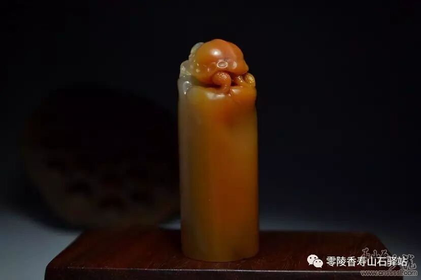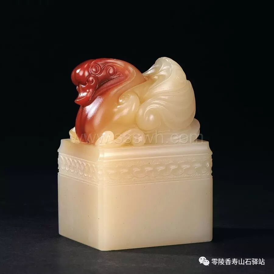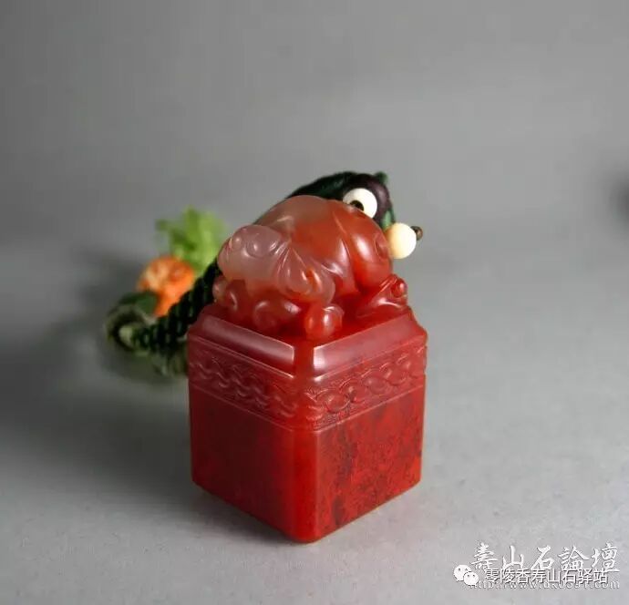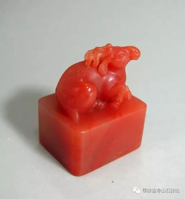 这枚梅花鹿钮印章是有出处的,上海博物馆历代印章馆中收藏了一枚犀角制梅花鹿钮印章,神态憨厚,身形机敏,而整体却呈现古茂拙朴的气息,当真是妙趣无穷。孙洁鸣的灵感就此激发,他根据印石与犀角的材质特点,对鹿的姿势和神态都略作变化,就表达出不一样的风格。这枚印石通灵剔透,橙红的俏色明艳、跳脱,孙洁鸣的设计的线条再次强化了这一特点,在他的雕琢之下,这只小鹿更加健壮,更加俊俏,也更加活泼,轻盈和灵动的天性被发挥的淋漓尽致。