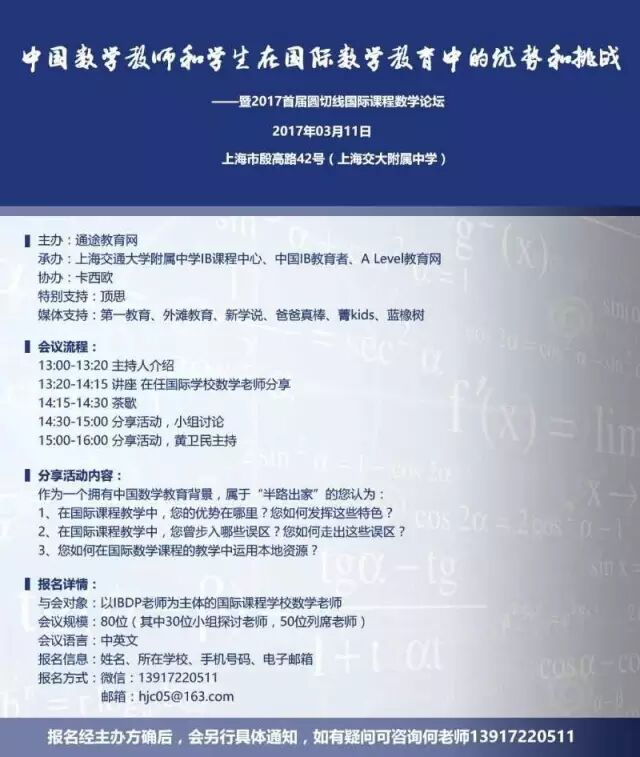 首届“圆切线Tangent”国际课程数学研讨会,将于2017年3月11日在上海交通大学附属中学举办,诚邀各位国际课程数学老师一起来探讨!