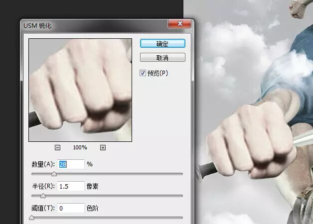接下来,我们来做一点锐化。盖印当前图层,并且这一层转为“智能对象”,打开“滤镜”-“锐化”-USM锐化“。由于本来手就不清晰,我们就着重看看手。其他的等会在智能滤镜的蒙板中擦拭就好。