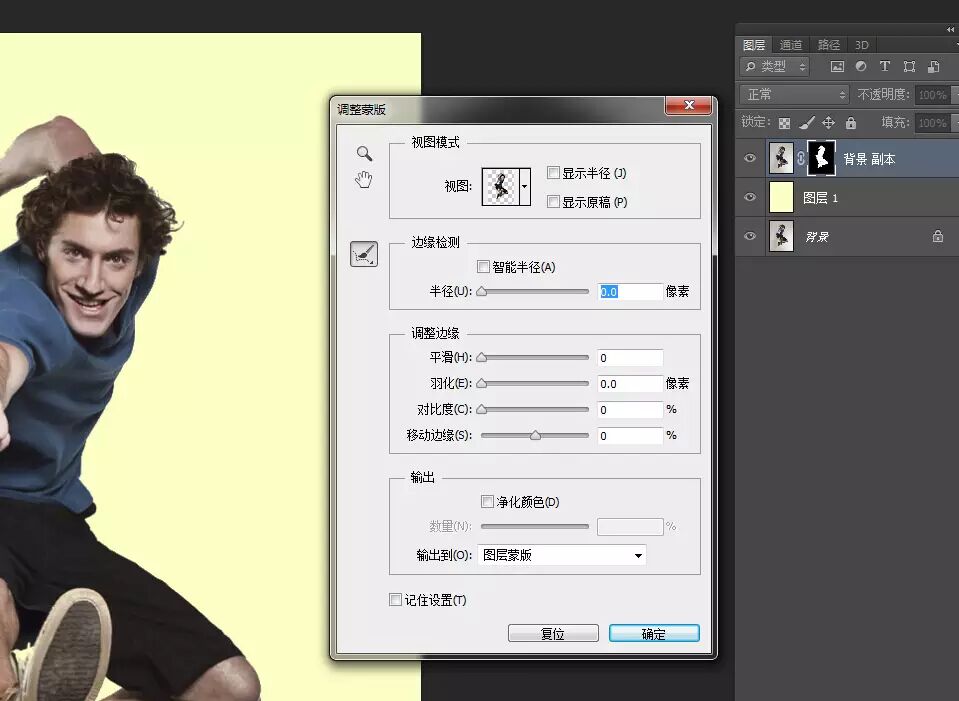 然后,右键点击蒙板,调整蒙板,调一下边缘,继续输出蒙板。