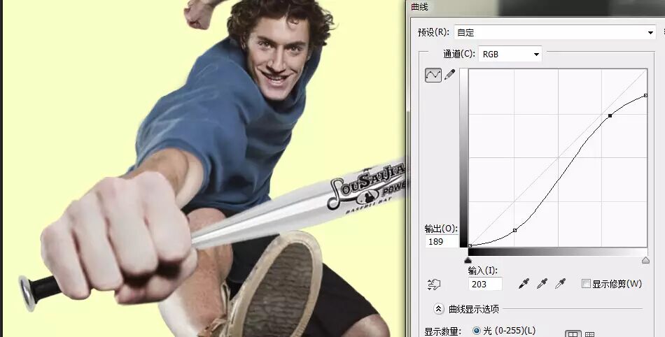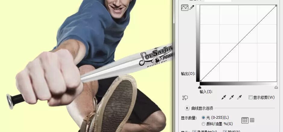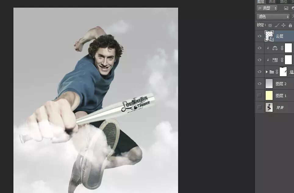 完成之后,置入棒球棒素材,魔棒抠出,合适的位置置于拳头下方。边缘粗糙通过调整蒙板来改善,不赘述了。和上面一样,都是基于蒙板的。