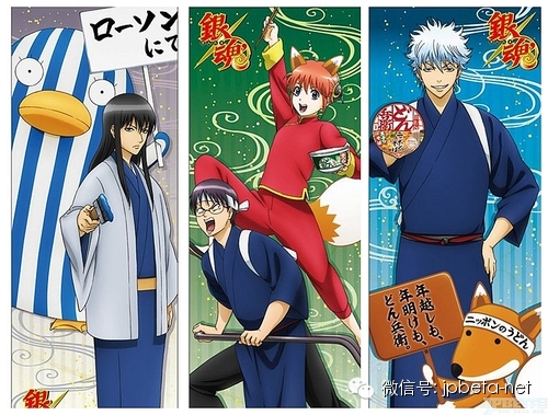 日本罗森从12月23日开始启动新一轮与《银魂》联动的“买碗面送海报”活动,即日起至2015年1月5日,在罗森购入两个日清兵卫面(どん兵衛)就可以得到活动特制的《银魂》海报。