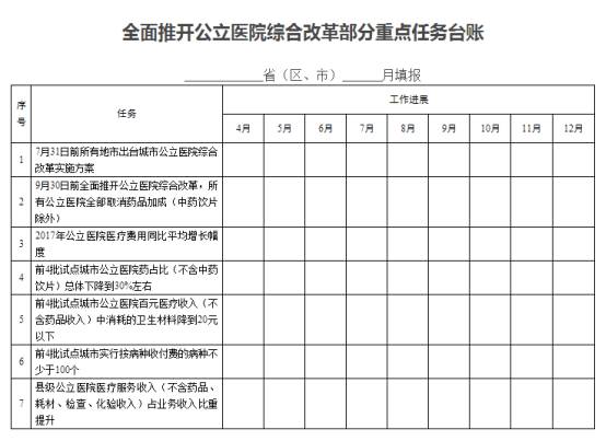 4)所有地市7月31日前出台城市公立医院综合改革实施方案并上报备案,9月30日前,全面推开公立医院综合改革。