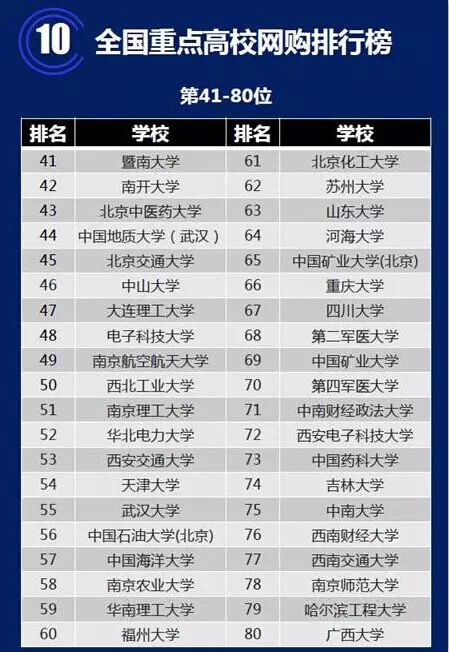 这份榜单中,复旦大学以人均390元的食品网购额遥遥领先,是榜眼上海外国语大学的两倍!而国防科学技术大学、中国科学技术大学、第二军医大学等学校,也赫然出现在这份榜单上。
