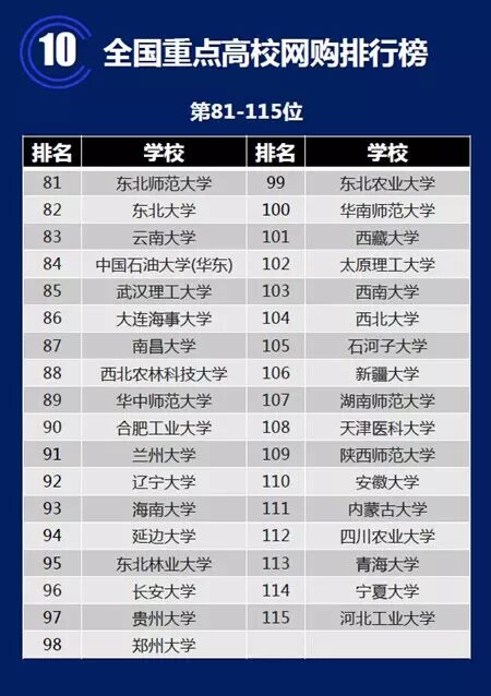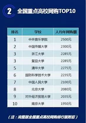 报告数据显示,全国重点大学生年均网购额为1100元,人均年收到的包裹数为16.2个。而在全国重点高校中,中央音乐学院、中国传媒大学、浙江大学分列前三;年人均花费2500元的中央音乐学院排行居首。