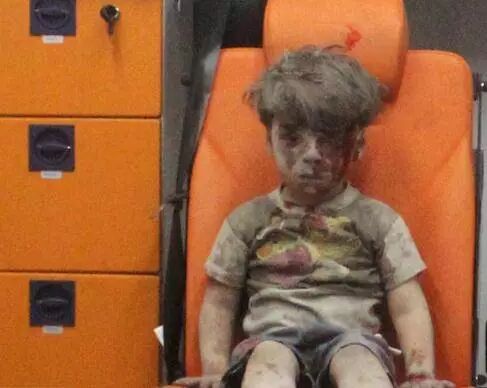 还是叙利亚,躲过空袭的小男孩全身是土,血流满面,一脸茫然。.
