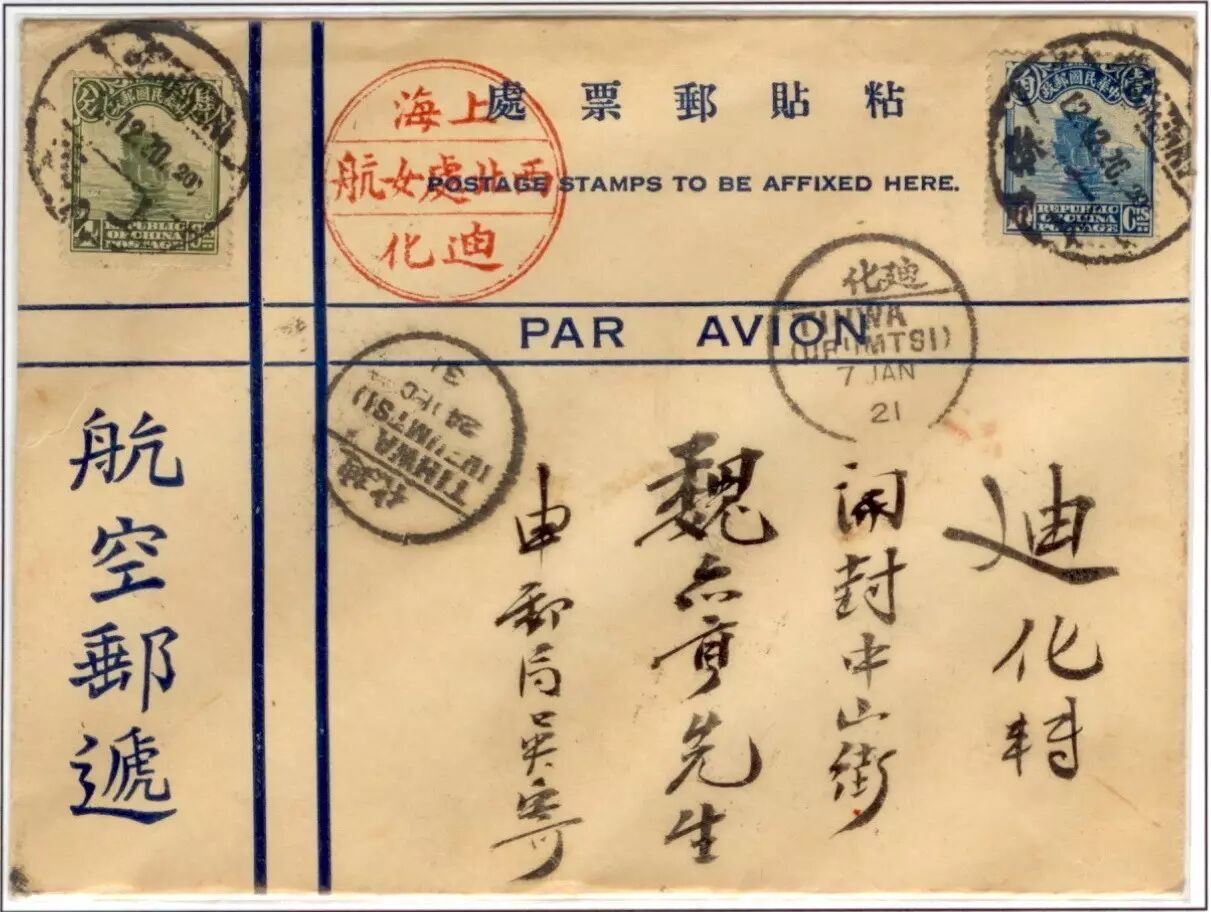 空军装备部原部长魏钢先生收藏的欧亚航空上海–迪化首航实寄封,此封十分珍贵,迄今只发现一枚。