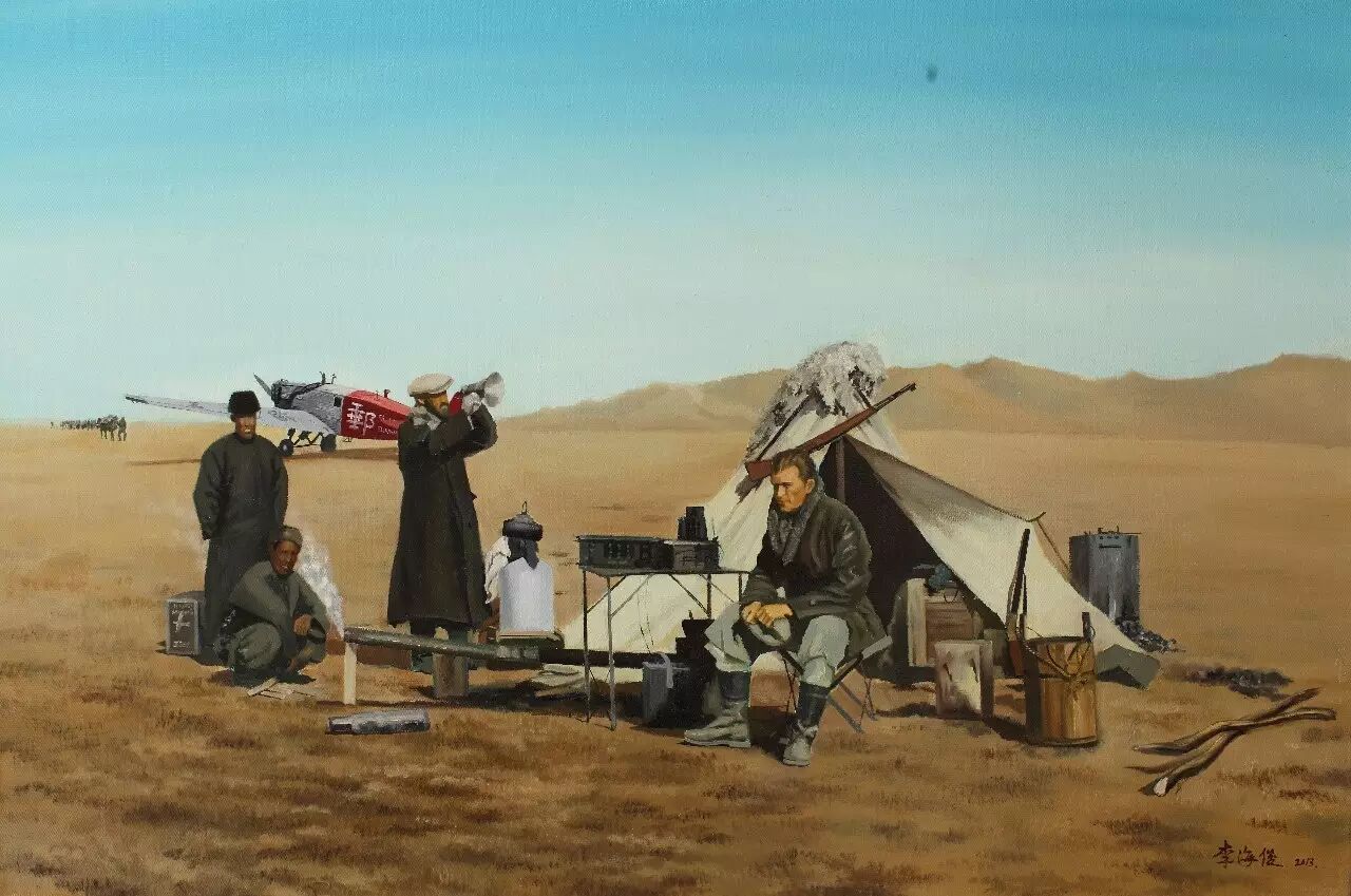 1931年,中德合资的欧亚航空公司决定开辟经新疆到苏联往欧洲的航线。12月14日,欧亚航空公司一架容克W33型飞机开始试航上海–北平(今北京)–归绥(包头)–百灵庙–弱水河(今额济纳旗)–哈密–迪化(今乌鲁木齐)航线。此次试航极为艰险,沿途多为草原荒漠,人烟稀少。单发容克W33通信导航设备简陋,且没有气象预报支持,试航难度极大。试航由欧亚聘请的德国飞行员负责,为了保证试航成功,欧亚航空公司事先用骆驼将油料和保障人员运进弱水河,开辟简易着陆场。但飞机12月21日黄昏到弱水河后未找到着陆场,只得在野外着陆过夜。天亮后飞机用仅存的一点油料升空,寻找简易着陆场,未果后从空中发现一名牧民,着陆询问后再次起飞,才找到简易着陆场,得以补充油料,再次起飞前往哈密和迪化。此画即作者根据历史记录绘制的德方飞行员在额济纳旗着陆过夜,等待天明之情景。