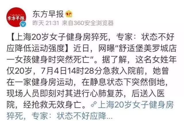 上海20岁少女健身猝死!预防猝死谨记下面几点!