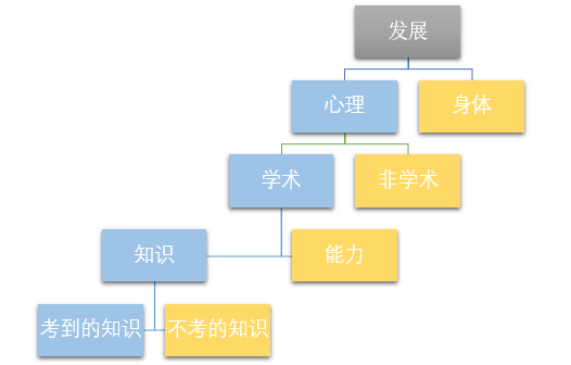 回过头来,未来的学校学什么呢,就是要让孩子全面发展,也就是指心智和体力都要发展,心智方面又包括学术的和非学术的,学术里面又包括知识和能力的,知识又包括考核制度。