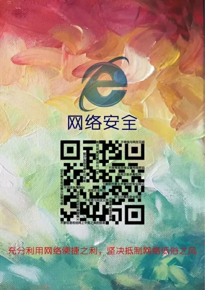 作品背景为彩色,寓意网络带给我们五彩的世界,而同时又代表网络中的各种诱惑。作品的内容主要由一个互联网的标志,中心主题“网络安全”,一个二维码和最下方红色字组成。互联网的标志和中心主题文字更不用说,为的是一眼让人知道这是一张关于网络安全的海报。二维码的使用,主要源于近年来身边二维码的使用频率的提高,此二维码的不再是以商业或者其他带有个人私利的作用出现在同学们面前,其中夹杂的文字是提醒同学们在日常生活上网的注意事项。最下方的红色字则为对同学们的呼吁,号召同学们共同注重网络安全这一问题,文明上网。