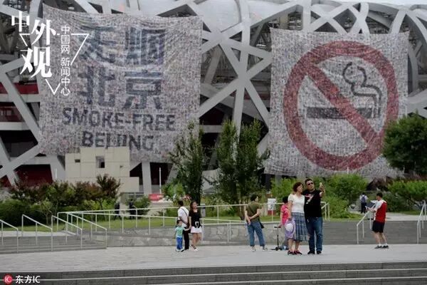 2016年5月31日,世界无烟日,北京“鸟巢”挂出巨幅禁烟宣传画。(东方IC)